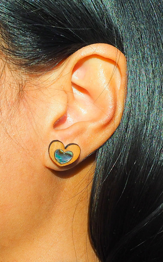 Love Heart Paua Shell Wooden Rimu Stud Earrings
